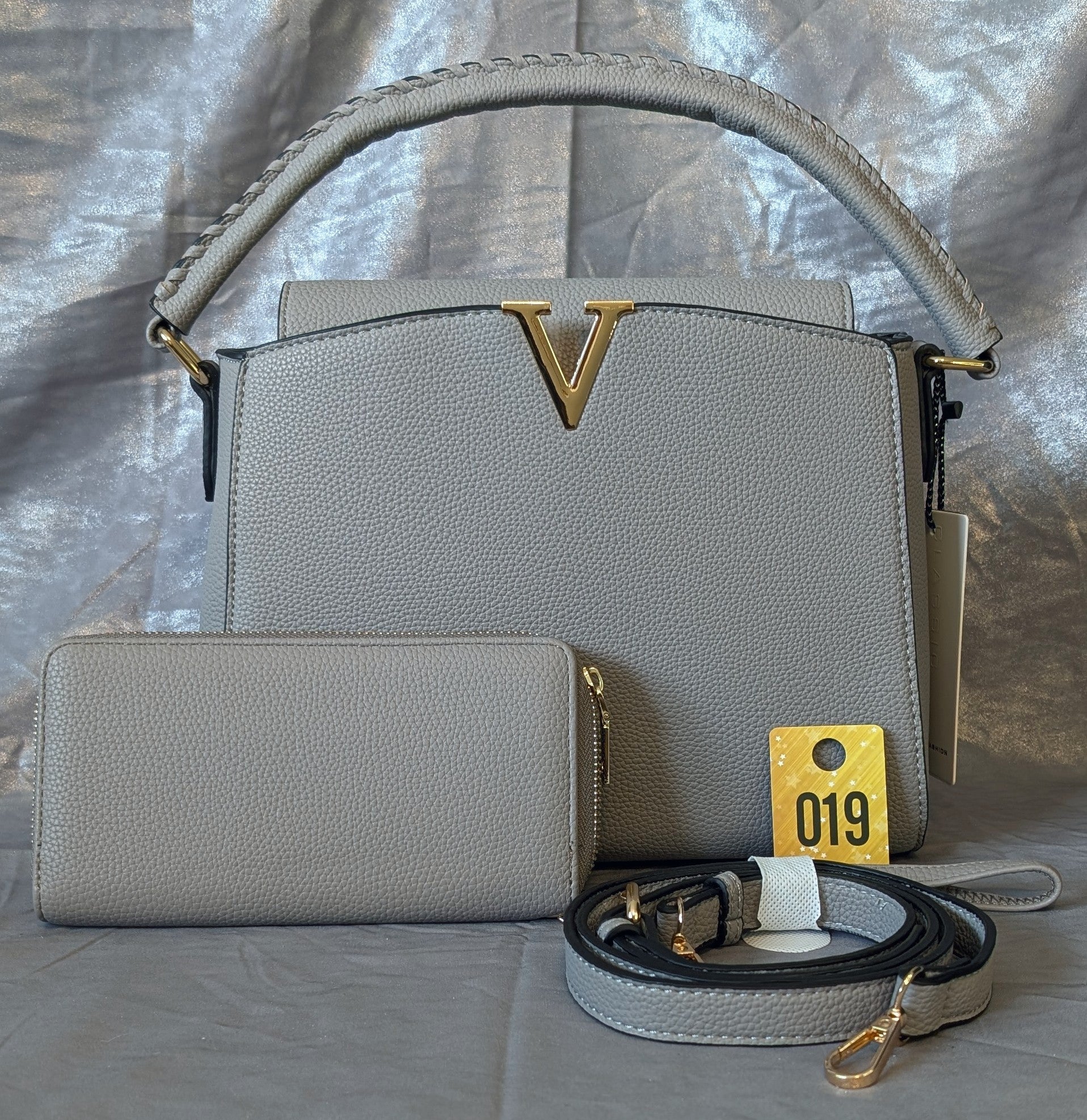 Gray “V” Designer-Inspired Handbag & Wallet Set